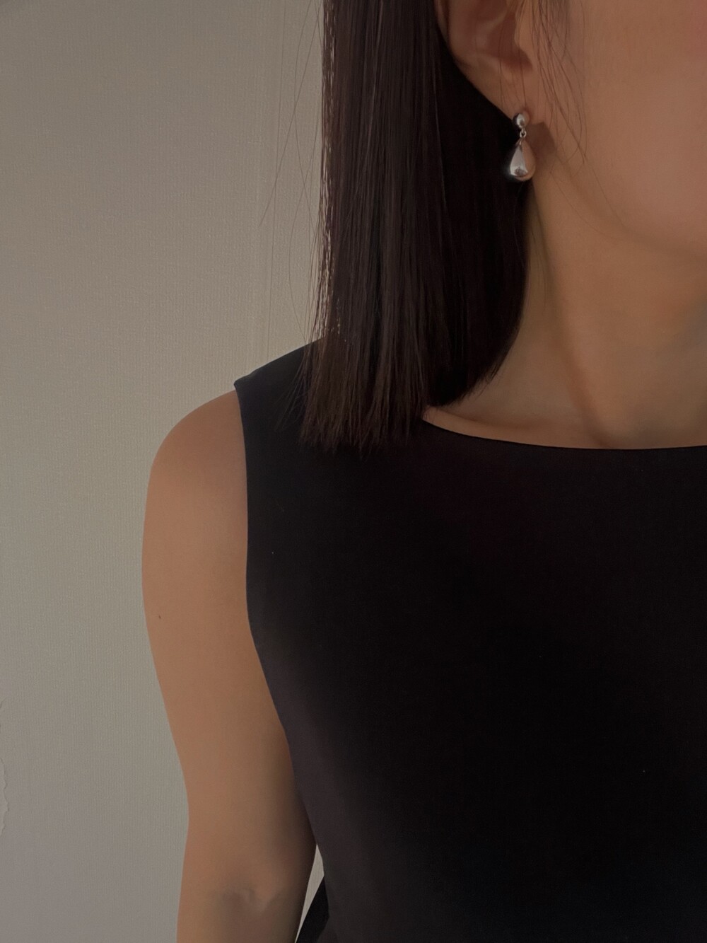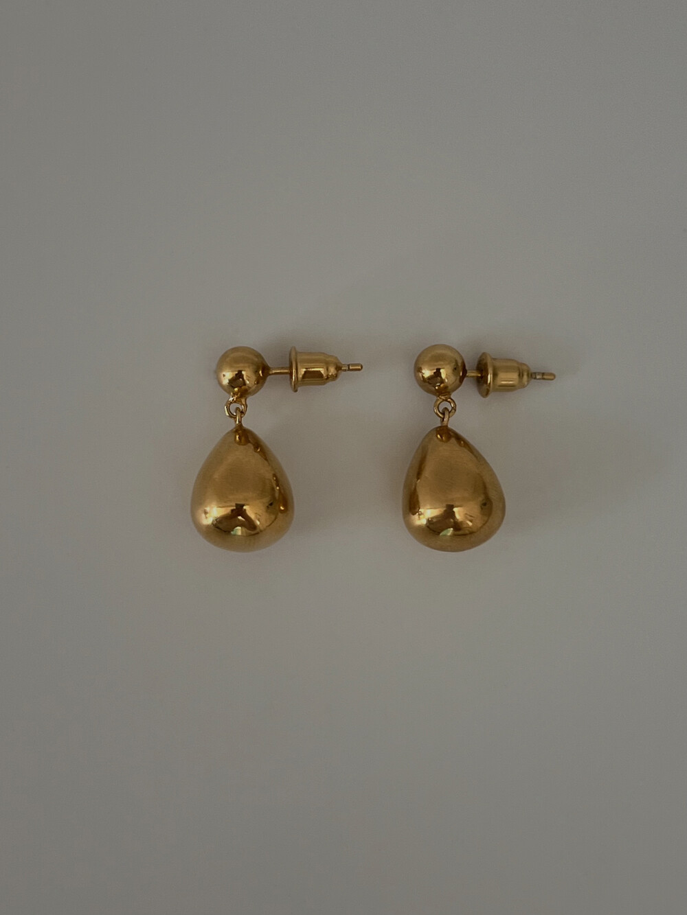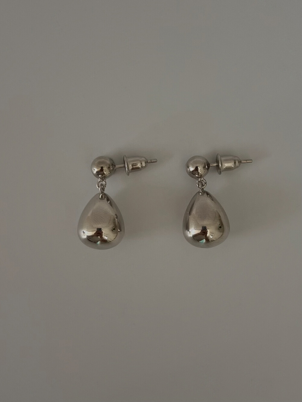 작은 실버볼과 물방울 모양의 펜던트로 이루어진 이어링입니다.